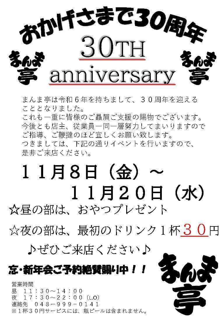 平素は格別のご愛顧を賜り、厚く御礼申し上げます。おかげさまで当店はこのたび、開店30周年を迎えることができました。これもひとえに地域の皆様、そして日頃からご来店くださるお客様の温かいご支援のおかげでございます。心より感謝申し上げます。